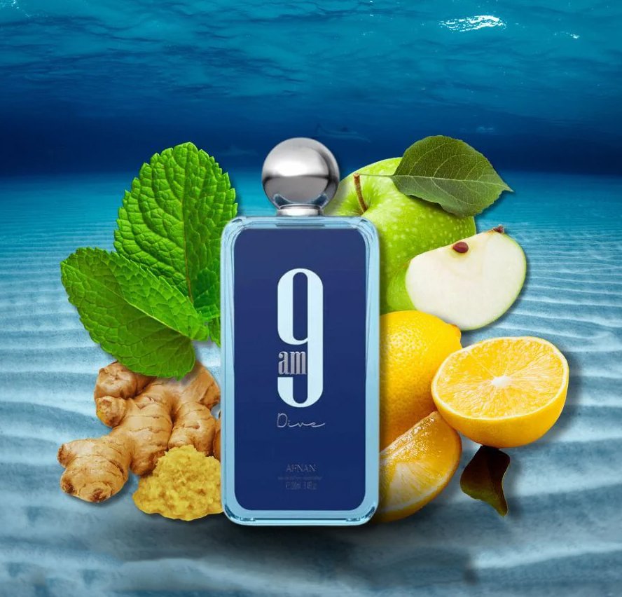 9 AM Dive, fragancia fresca y vibrante con aroma limpio y duradero, ideal para uso diario, climas cálidos y momentos casuales.