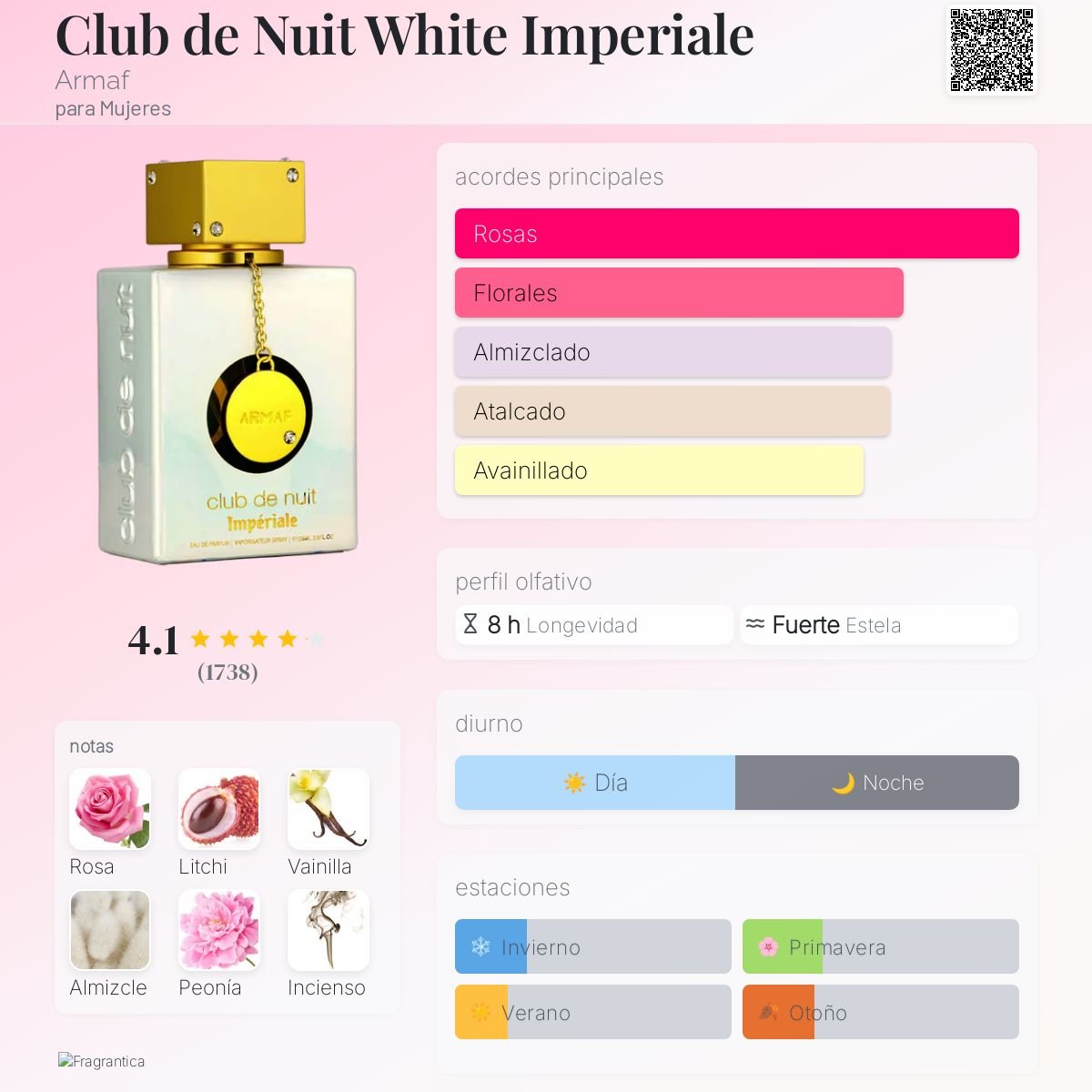 La composición de Armaf Club de Nuit White Imperiale combina notas florales suaves con matices dulces y un fondo cálido, creando una fragancia equilibrada, envolvente y muy femenina. Su apertura es fresca y luminosa, seguida por un corazón floral elegante, finalizando con una base cremosa y duradera que permanece en la piel por horas.