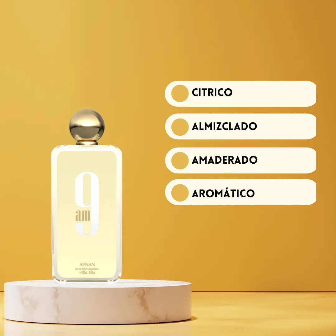 Afnan 9 AM es una fragancia fresca y moderna que destaca por su estilo ligero, elegante y lleno de energía. Diseñada para quienes buscan un perfume versátil y fácil de usar, esta fragancia es perfecta para comenzar el día con una sensación de frescura y confianza.
