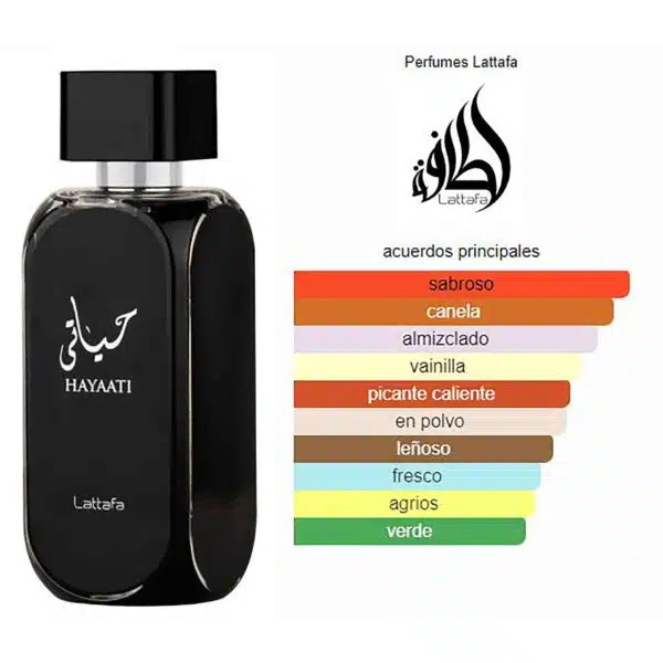 La composición de Lattafa Hayaati Black combina notas frescas y ligeramente dulces con un fondo cálido y amaderado, creando una fragancia envolvente y agradable para el uso diario. Su perfil equilibrado lo hace ideal tanto para el día como para la noche, adaptándose fácilmente a diferentes ocasiones y estilos personales.