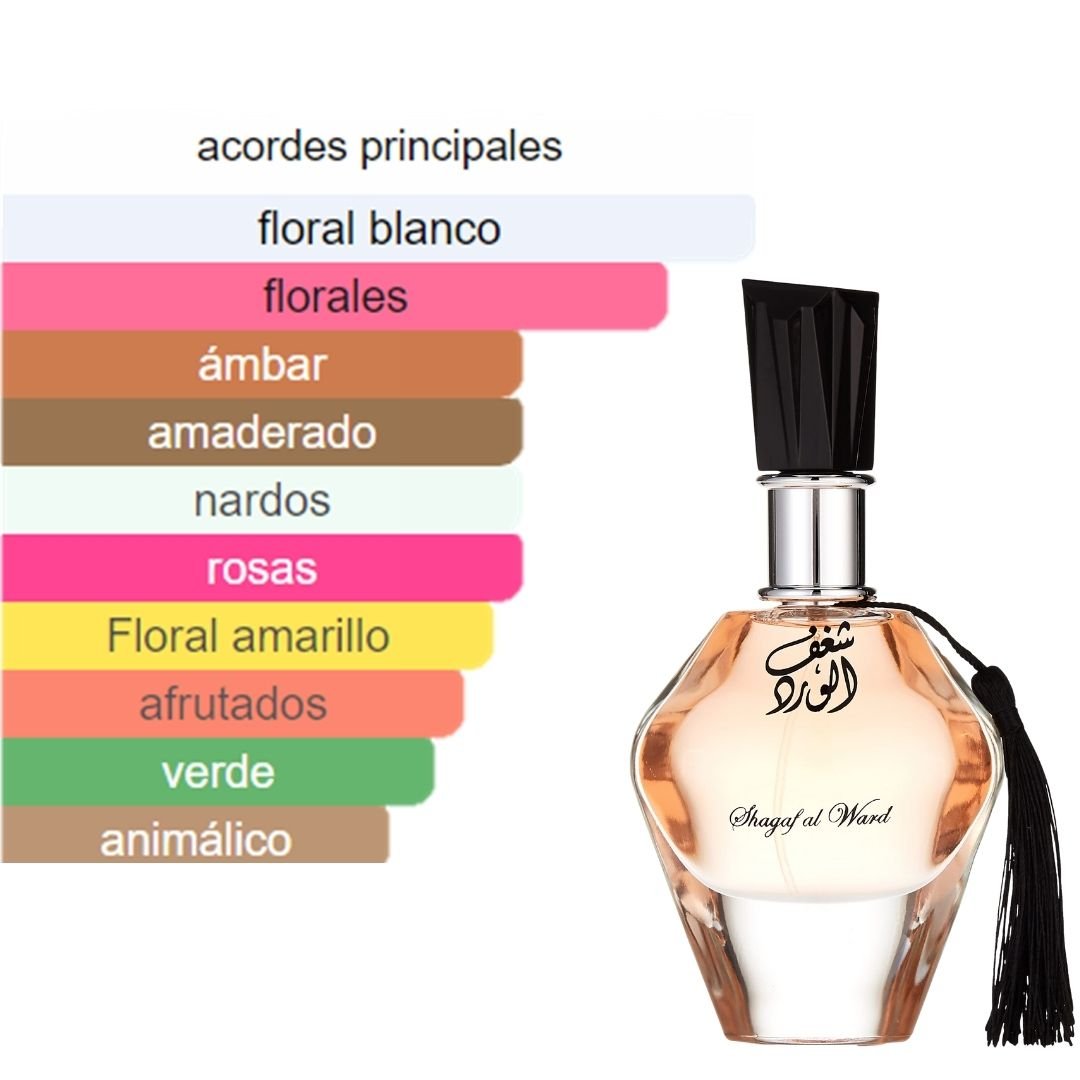 La composición de Shagaf Al Ward gira en torno a un bouquet floral intenso y delicado. En la apertura, se perciben notas de rosa de mayo, jazmín y osmanto, creando una sensación fresca, femenina y luminosa. En el corazón, aparecen acordes de nardo indio y narciso, que aportan profundidad floral y un carácter más elegante. Finalmente, su base de ámbar y cedro brinda un fondo cálido, suave y duradero en la piel .