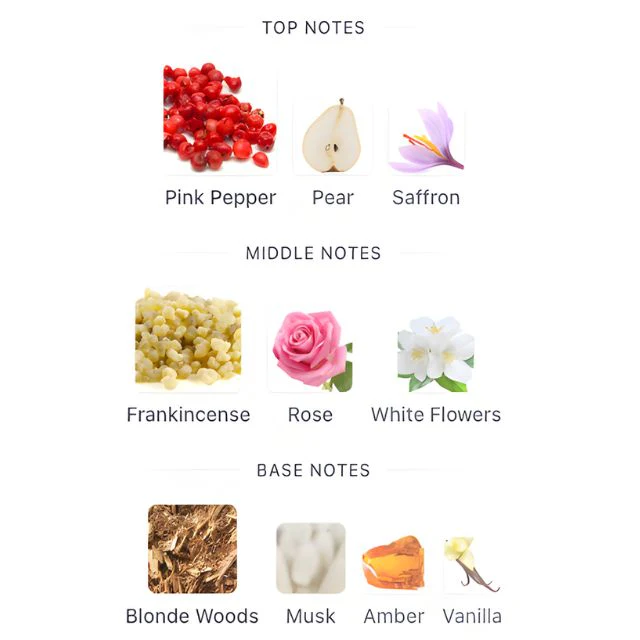 Las notas de salida de Rasasi Hawas London incluyen pimienta rosa, azafrán y pera, ofreciendo un inicio fresco, atractivo y ligeramente especiado que captura la atención de inmediato. En el corazón, esta fragancia revela un bouquet equilibrado de incienso, rosa y flores blancas, aportando delicadeza, profundidad y un toque floral que equilibra la base amaderada. Las notas de fondo combinan maderas rubias, almizcle, ámbar y vainilla, dejando un rastro duradero y envolvente que transmite calidez y sofisticación.